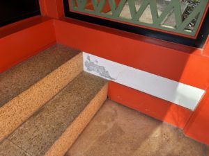 鉄扉の錆と腐食、壁面の朱色、ホワイト部の塗膜剥離が発生していました。