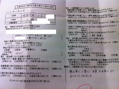 先日、施工完成したお客様からありがたいアンケートをいただきました。