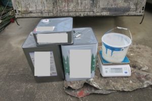 材料は2液型塗料のため、ハカリを使って指定量の硬化剤を調合しました。
