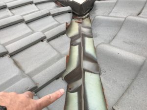 屋根の谷の銅板水切りが腐食して穴が開いていました。