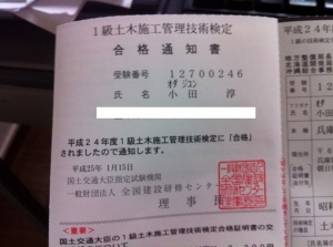 1級土木施工管理技士の合格通知書が届きました。