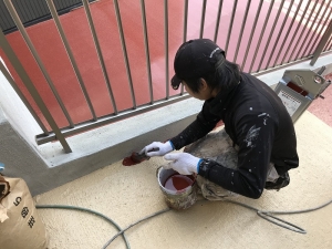 ローラー、ハケで塗りながら、防滑用硅砂をリシンガンで吹き付けます。
