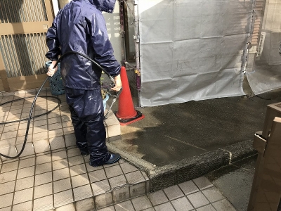 土間コンクリートまわりも洗浄させていただきます。