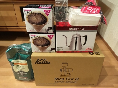 コーヒー豆を粉にする機械ナイスカットGとIH用ステンレスポットはカリタ。