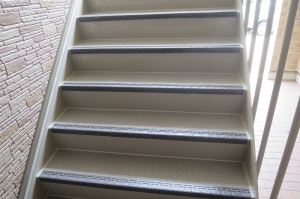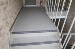 階段廊下踊場床にタキロン㈱のタキステップ、タキストロンを施工することによって遮音性、防滑性がアップしました。