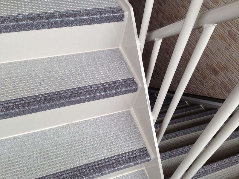 階段廊下踊場床にタキロン㈱のタキステップ、タキストロンを施工することによって遮音性、防滑性がアップしました。