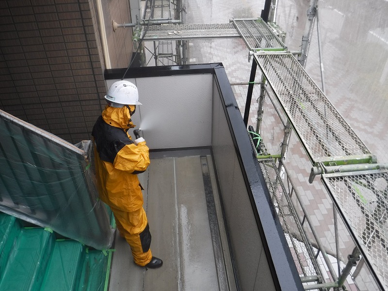 高圧洗浄のため、水しぶきの飛散に気をつけて施工しました。