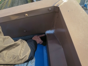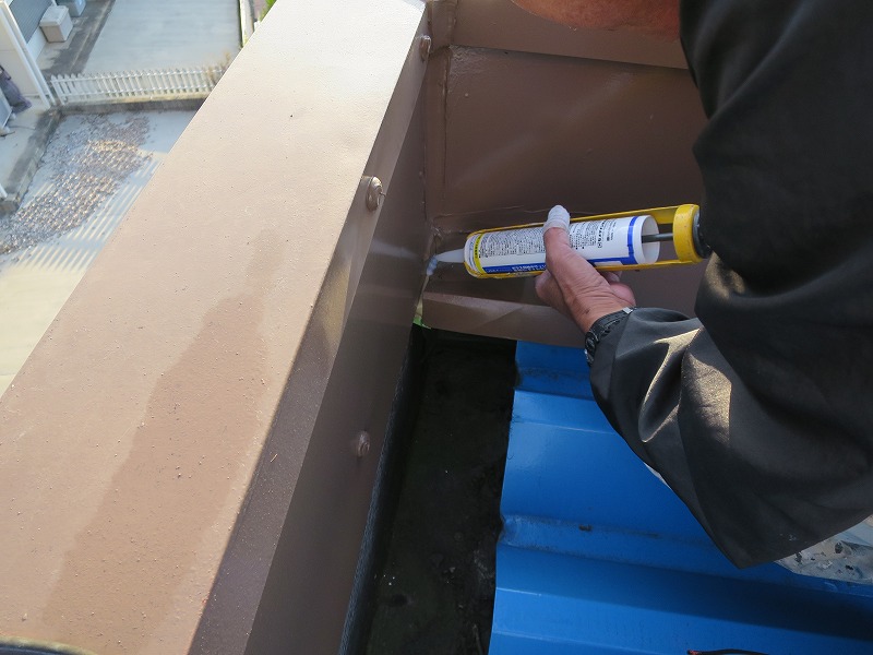南東の角に雨だれがあったので、屋根に昇り上部をコーキング打設させていただきました。