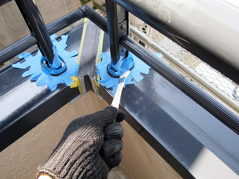 弊社はクラック補修、バルコニの手摺根本やアルミ入隅部のコーキング打設工事も施工しております。