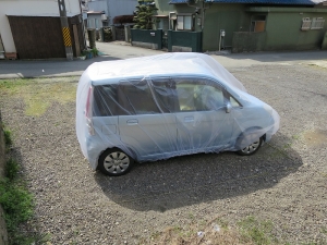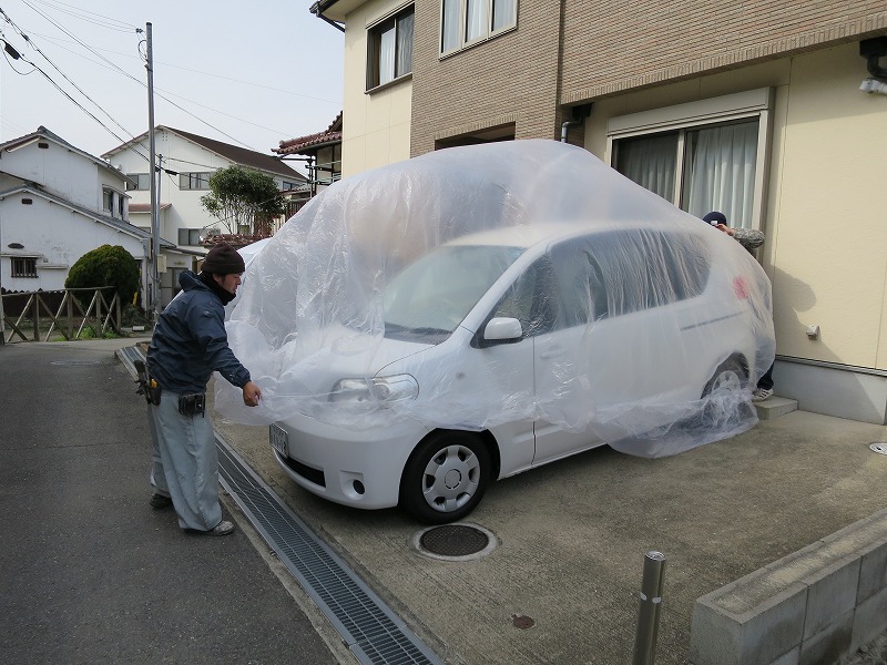 塗装、塗替え現場の近隣様のお車にはカーカバーをかけさせていただいています。