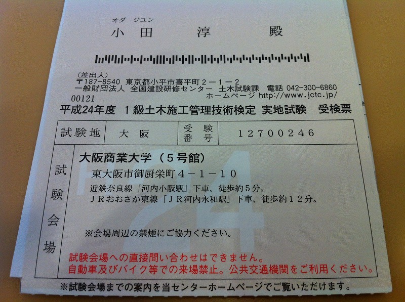 1級土木施工管理技士の二次試験の受験票が届きました。