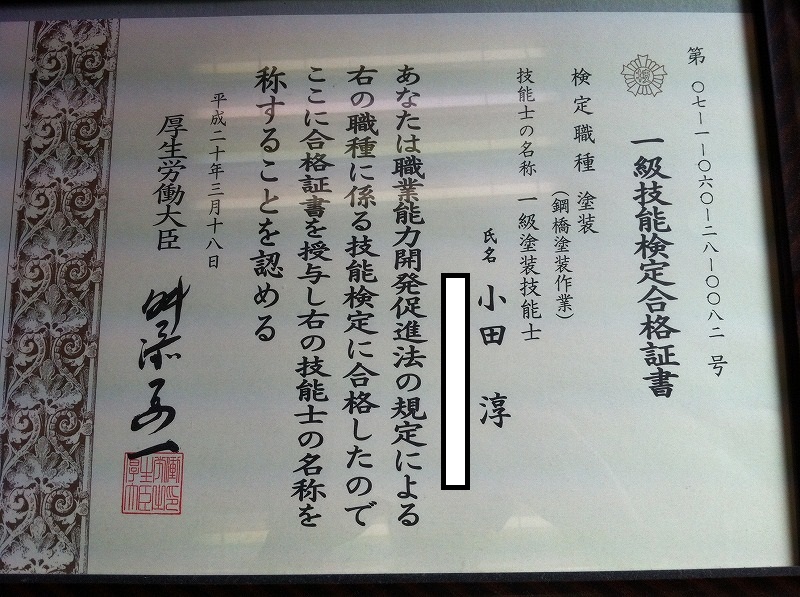 4年前に取得した1級塗装技能士の資格です。