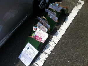 いつも粗品としてサランラップとゴミ袋を持参しております。