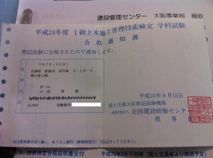 先日、一級土木施工管理技士の学科試験の合格通知書が届きました。