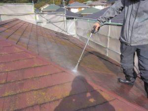 屋根カラーベストのカビ、コケと外壁まわりの汚れを洗い流しました。
