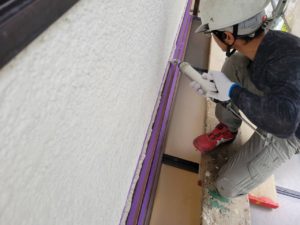 紙テープ養生→プライマー下塗り→コーキング打設の流れで無事完了しました。
