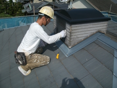下記写真は弊社の職人が問い合わせのあったお客様の屋根煙突まわりの雨漏れ防止処理(コーキング打替え)をしているところです。