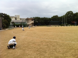 グランドを傷つけないようにできるだけ端を通ります。