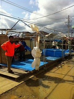 その後、強風警報が出ており、仮設風呂のテントが危ないとのことで