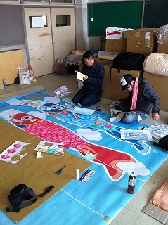 初日は、避難所の子ども達に渡す駄菓子の調達と鯉のぼりの制作をしました。仙台駅周辺に関しては、水や食料が無いなどの不便さもなく、震災の影響をほとんど感じることもありませんでした。その後、28日から現地入りしている、Kさん、Mさんと合流し、仙台で夕食ととりました。