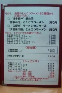ラーメンはあっさり博多(虎)ラーメンとしっかり久留米ラーメン(龍)のどちらかから選べます。