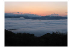 佐用町は、周囲を山に囲まれた盆地にあり、晩秋から冬にかけての早朝、町は霧におおわれます。大撫山から望む朝霧は、夜明けの日差しをあびて幻想的に色を変え、心を誘う表情を見せてくれます。 年間百日ほど発生するこの霧の美しさは、佐用の朝霧として全国的にも有名です。