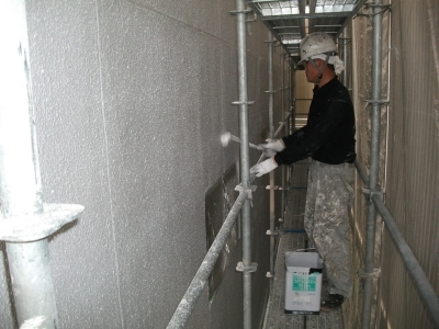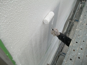①まずは、外壁の高圧洗浄後1回目の塗装です。