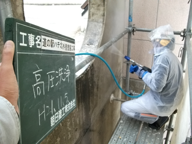 まずは、下地処理です。高圧洗浄でコケや汚れを落します。