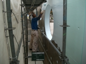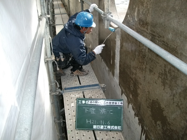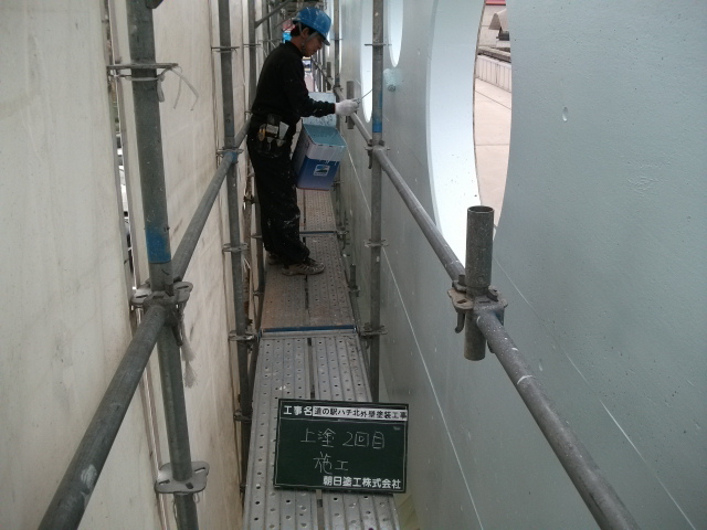 道の駅の利用者がいますので、塗料の飛散に気を使いました。出入り口の天井部分はペンキが落ちないように、ビニールで養生しました。