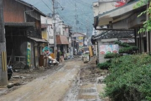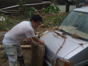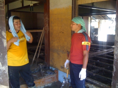 ボランティアの主な作業は家に入った泥の掃き出しと使えなくなった家具の運搬でした。 スコップでひとかきしたら屋外に泥を出す作業を繰り返し、泥と暑さとの闘いでした。 これが大変重労働でした。