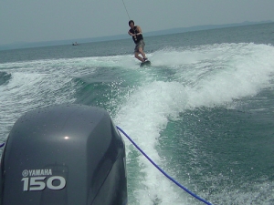 昼食後、海水浴場にある飛び込み台を制覇し、先輩の薦めでウエイクボードを初めてしました。