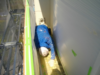 職人がバルコニの窓下のわずかな壁を寝転がりながら塗装しているところです。