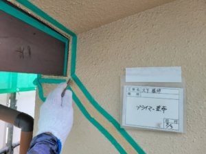 たて目地の両側にマスキングテープを貼り、プライマー(接着剤)を下塗りします。