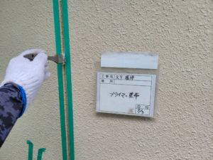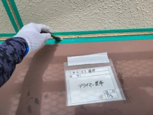 たて目地の両側にマスキングテープを貼り、プライマー(接着剤)を下塗りします。