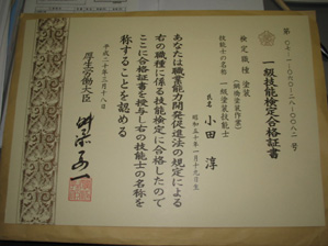 昨年度に受けました、国家資格の1級鋼橋塗装作業技能士の合格証書が届きました。合格書には厚生労働大臣の舛添さんの名前が入っていました!!