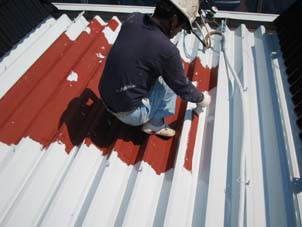 この屋根の形状は、山・谷交互になっているため、足元が不安定で、足腰が強くないと、塗装できません。