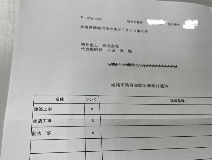 先日、姫路市業者登録名簿格付けの書類が届きました。