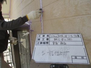 プライマー下塗り→変成シリコンコーキング打設→テープ養生撤去