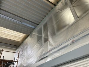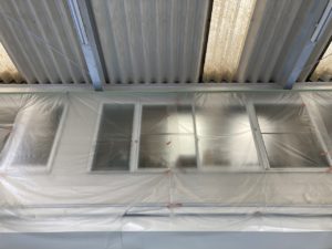 天井鉄骨の塗装と鳥よけネット張り付け工事です。