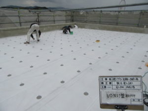 →塩ビシート敷き込み→溶着処理→脱気筒取付→端部処理