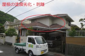 屋根の塗装が剥離し、汚れの付着が発生していました。