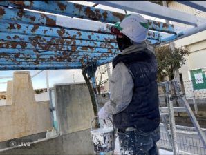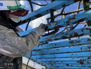 養生→剥離部サンダーケレン→錆止め下塗り→トップコート上塗りの工程で施工させていただきました。