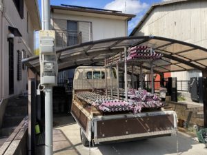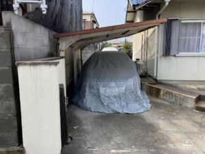 布製車カバー新品をお渡しして隣家のオーナー様に取付けをお願いしました。