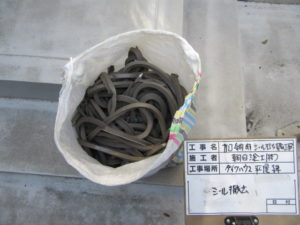 養生→ケレン→コーキング処理→プライマー下塗り→フッソ樹脂上塗り2回塗りの作業工程です。