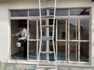 窓サッシ鉄枠、バルコニ手摺鉄部、テラス木部柱・梁、車庫シャッター枠を塗装しております。